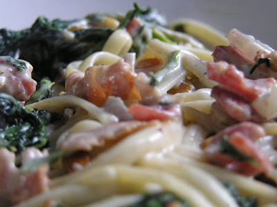 This is more of a fall dish, so the fact that I'm raving about it in the middle of the muggy KS heat says something. It was creamy but not too rich, and the bacon and garlic really flavor the dish well. The leftovers re-heated pretty good (no curdling that you sometimes get in a cream pasta dish), so a total winner in my book. Be sure to use fresh spinach in this dish - I bought spinach but it went bad before I could use it, so used frozen instead. The spinach was a bit too clumpy that way...